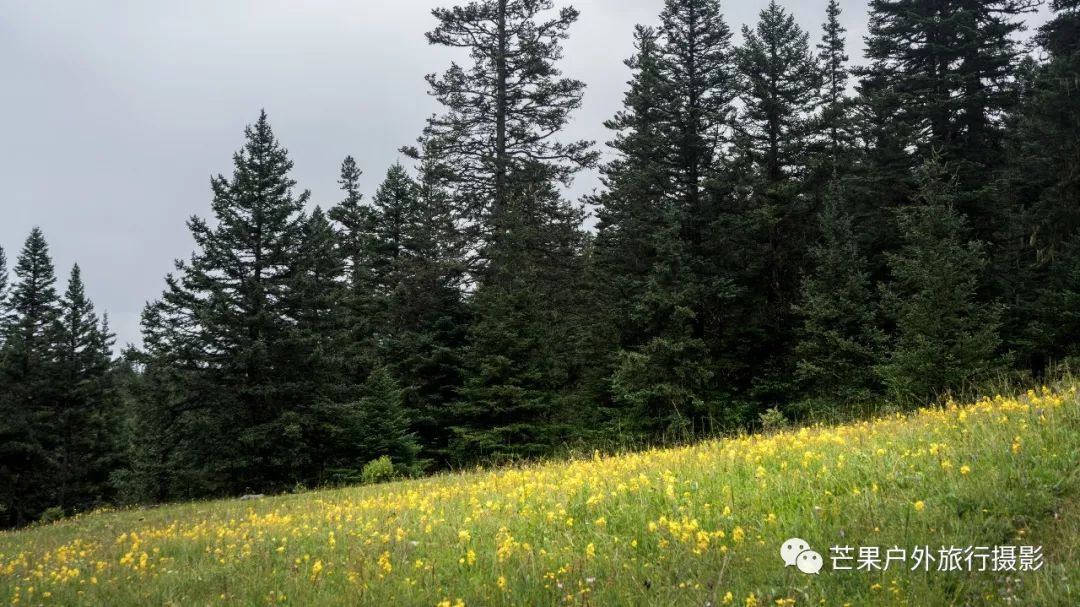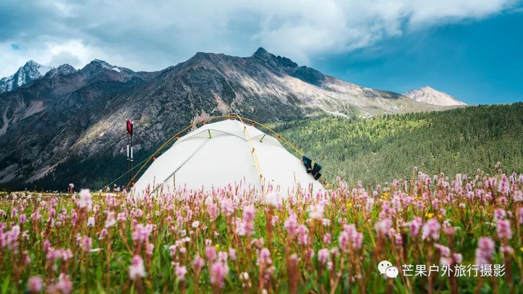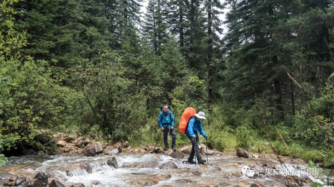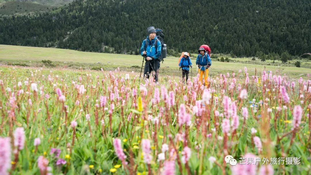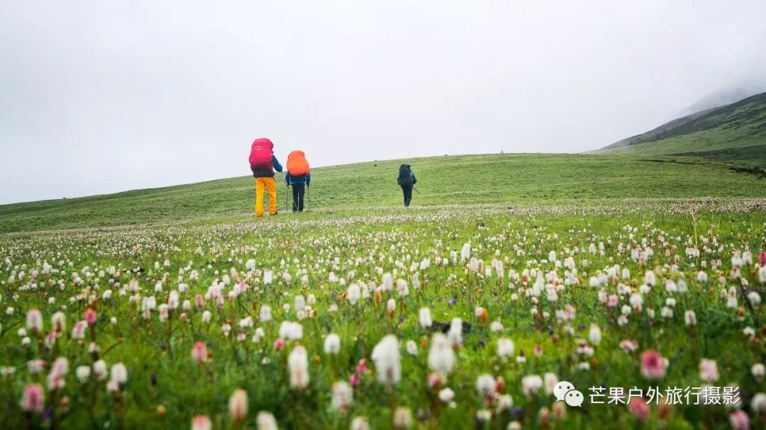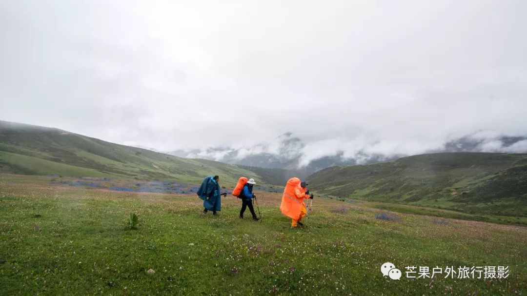 昨夜下了一夜的雨,早晨的多云天气晴朗,然而这一切都是幻觉!我们从营地开始第一个小幅度爬升,然后就开始草原花海漫步之旅。这里草原辽阔,花海盛开,只需要低角度便可拍摄绝美的花海大片。一路在花海中徜徉,走到经幡处,这里花海开得极其旺盛。阴雨绵绵的天气,丝毫不影响我们对风景的执着,同样可以拍出美美的照片。斜切草地,上行至山脊,再下行上山脊,便可看到整个岛岛河谷的全貌,碧绿的河水犹如一条巨龙匍匐在青翠的大地之上,远处雪山一直藏于云雾之中。继续穿越原始森林,下行至河谷,雨季水很大,需要脱鞋过河,最深处触及大腿。过河需要一定的经验,小心被水冲倒,最好去下游找到一个特别安全的过河点,我第一次过河的点我觉得队友可能过不去,于是到下游去寻找了一处水流未超过膝盖的位置,队友都安全过河,我们在河边草地休息片刻,顺便补给午餐。穿越岛岛河谷到达陡坡下,此处陡坡是今日爬升最难的点,比较费力。上到坡顶,就开始沿着路迹一路下行至热梯河谷,需要过一处大河,河流深至大腿根部,但是水流较缓,安全度过。一路沿着湿地路迹走到热梯河谷草地,草地开满了小花,这里绝对是五星级营地的享受。