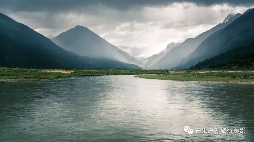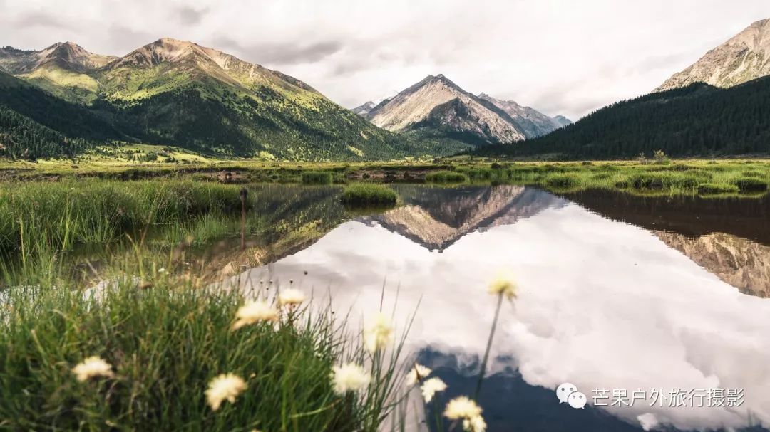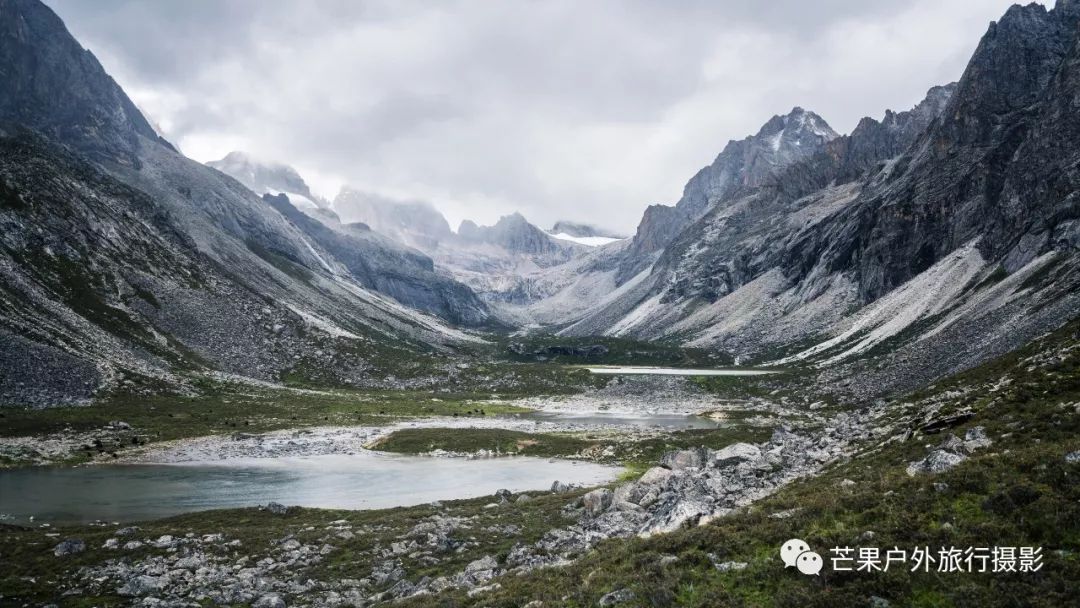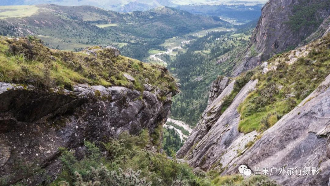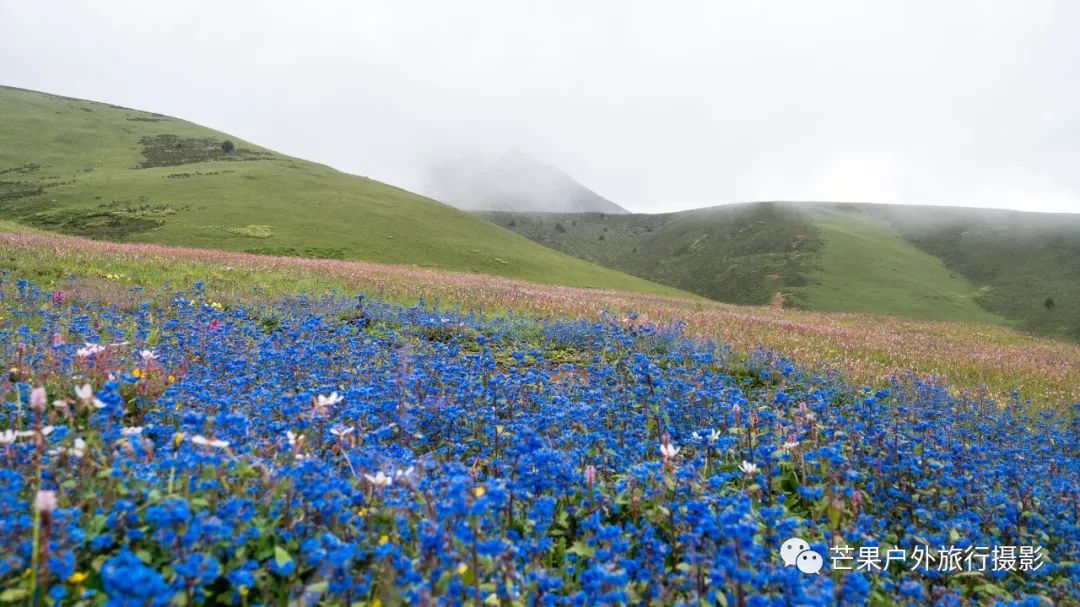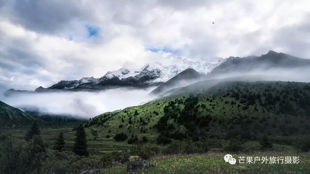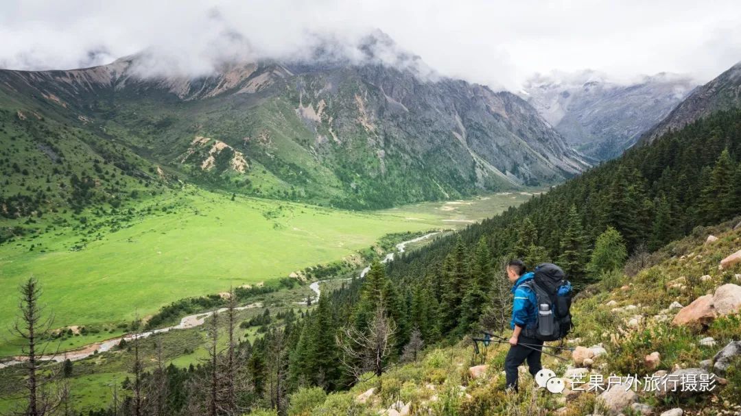 昨夜下了一夜的雨,早晨的多云天气晴朗,然而这一切都是幻觉!我们从营地开始第一个小幅度爬升,然后就开始草原花海漫步之旅。这里草原辽阔,花海盛开,只需要低角度便可拍摄绝美的花海大片。一路在花海中徜徉,走到经幡处,这里花海开得极其旺盛。阴雨绵绵的天气,丝毫不影响我们对风景的执着,同样可以拍出美美的照片。斜切草地,上行至山脊,再下行上山脊,便可看到整个岛岛河谷的全貌,碧绿的河水犹如一条巨龙匍匐在青翠的大地之上,远处雪山一直藏于云雾之中。继续穿越原始森林,下行至河谷,雨季水很大,需要脱鞋过河,最深处触及大腿。过河需要一定的经验,小心被水冲倒,最好去下游找到一个特别安全的过河点,我第一次过河的点我觉得队友可能过不去,于是到下游去寻找了一处水流未超过膝盖的位置,队友都安全过河,我们在河边草地休息片刻,顺便补给午餐。穿越岛岛河谷到达陡坡下,此处陡坡是今日爬升最难的点,比较费力。上到坡顶,就开始沿着路迹一路下行至热梯河谷,需要过一处大河,河流深至大腿根部,但是水流较缓,安全度过。一路沿着湿地路迹走到热梯河谷草地,草地开满了小花,这里绝对是五星级营地的享受。