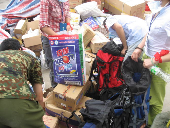 27号我带着他们急需的物资:GAGA和一些素菜去了救助站,到救助站门口看到铁门两边有两条醒目的横幅<抗震救灾,有我!>和<重庆69俱乐部救助站联络点>,在往里面看就是跨塌的房屋,一片狼籍,中间有块平坦的水泥地,营地的帐篷就扎在这,到了救助站籽籽让我去找一个说普通话叫FJ的人,找到FJ说明来意,我问他现在有什么能帮忙,能做的?他直接甩我一句:都做完了,刚卸了一车货,现在没什么做的了!说话还挺严肃,我想这家伙不好相处,赶紧把烟摸出来给他发烟,先套套关系(结果FJ是很随和的人,后来发现的).之后我和FJ帮院子里的老乡一起搭了帐篷.大概5点左右必然和籽籽他们回来了,营地一下热闹起来,他们回来的时候特亢奋,好象在哪个地方腐败了一次,吃了<太安鱼>!我把带来的GAGA和菜拿出来交给大橱廖平,哎~天气太热,肉捂久了有点味道了,不过晚上吃饭的时候FJ好象吃的比较开心,可怜的必然不吃猪肉,吃饭的时候喝了酒,结果喝高了,哎,第一天来就丢人了!籽籽的小黑帐上还给我记上了,说我有贪杯的坏习惯!哼哼!第二天上午没安排我的工作,下午才安排我和廖平一起出去走访,给老乡送他们需要的生活物资,出去之前籽籽喊我去掉了耳环,出去的交通工具是一辆问老乡借来的摩托,廖平这家伙摩托技术真的需要提高一下,坐他的车就是一直2档,慢了就轰油门,换档的时候离合松的太快,搞的车子一抖一抖的,进村的时候走的土路,这家伙差点把车开到水田里,不过在他的带领下,我们的任务圆满成功,回来的时候籽籽说2个壮丁的效率就是高...........在救助站的日子里我没有写日志,晚上的时候好象下半夜下雨了,我睡的那个帐篷外帐没拉好进水了,不过没多严重,到凌晨4点多的时候把我冻醒了,没想到这边晚上会那么冷,缩成一团,迷迷糊糊的天亮了,起来洗涑的时候刮着风,飘着雨,我冻的慢身都是鸡皮疙瘩,老江给我拿了个雨披,穿上后能挡风,感觉一下好多了,吃完早饭,雨没停他们去棚里打扑克,我回帐篷看书,然后睡着了,下午天晴了,我和籽籽,廖平背了2个75升的大包继续工作了,我们自称是3人小分队,嘎嘎!我和廖平负责背包,籽籽负责和老乡沟通,工作很顺利,晚上籽籽给我拿了个很暖和的被子,之前还给我拿了睡垫,这小姑娘人就是好啊!