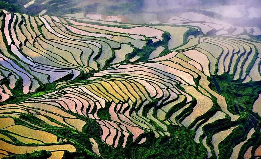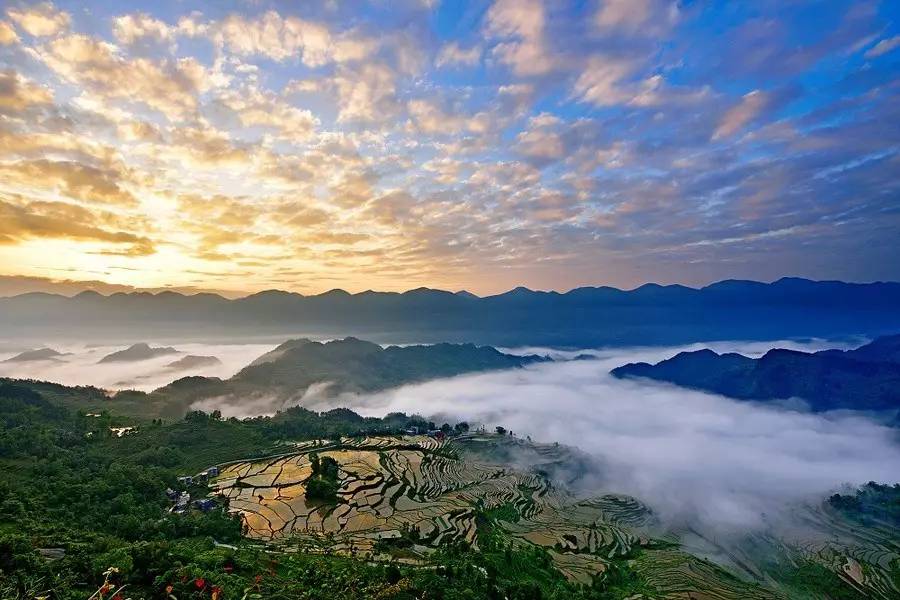 花田梯田处在海拔在700——900米的丘陵山坡,光照充足,昼夜温差大,山下终年龙 洞水流不尽,所以只要雨后天晴,极易形成云海,得天独厚的自然环境和良好的生态,这儿象是人间仙境,吸引了大批摄影爱好者前来。