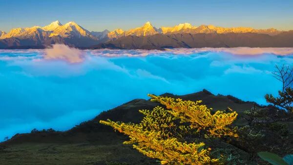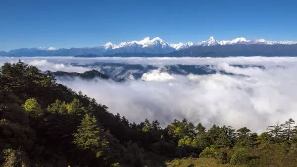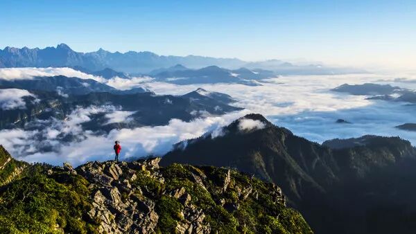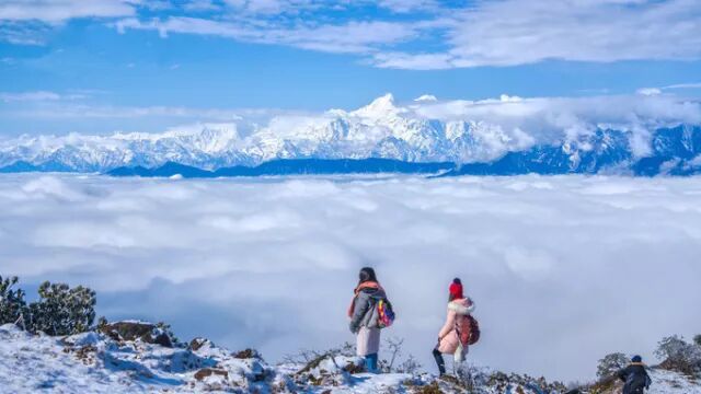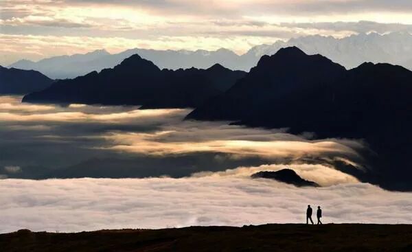 爬到山顶之后,眼前的景色瞬间让你忘记疲惫,站在山顶,视野十分开阔。放眼远处,云海茫茫,四人同山、牛背山、二郎山山山相依,远处的四姑娘山幺妹峰也若隐若现。
