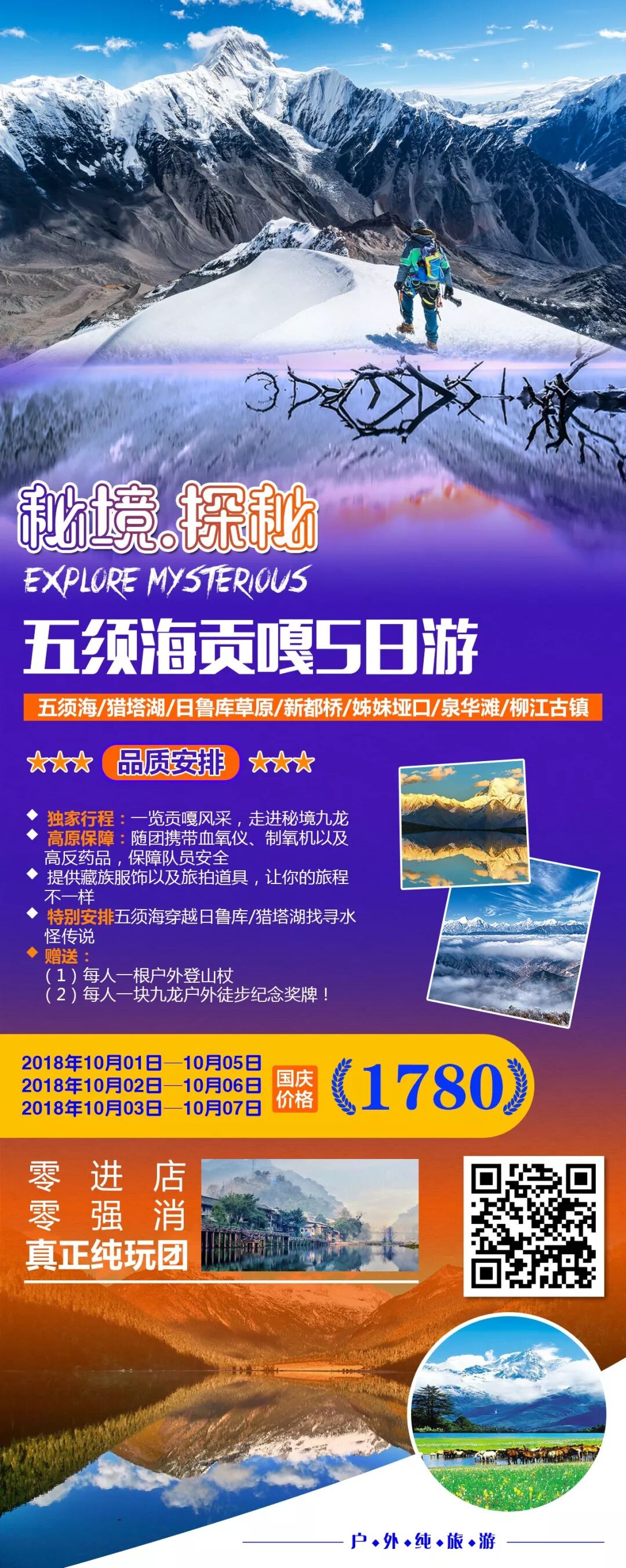【8月之内报名有优惠哟】 【名额有限,先报先得】 【品质安排】 1、独家行程;一览贡嘎风采,走进秘境九龙; 2、高原保障:随团携带血氧仪、制氧机以及高反药品,保障队员安全; 3、提供藏族服饰以及旅拍道具,让你的旅程不一样; 4、特别安排五须海穿越日鲁库/猎塔湖找寻水怪传说; 5、赠送: (1)每人一根户外登山杖 (2)每人一块九龙户外徒步纪念奖牌 ★★★秘境*九龙★★★ 伍须海:位于九龙县的北部。由山峰、原始森林、林中溪流,五花草甸、高山草甸与湖泊、奇树和各种珍稀动植物及独特的藏族风情组成。伍须海被当地人喻为“仙女梳妆的明镜”,原始森林和宽阔的草甸环绕湖泊,湖水碧绿透明,环境幽静。从夏到秋,周围百花盛开,争奇斗艳。古树盘根错节,藤枝攀延缠绕,杜鹃树向湖面,使伍须海显得原始、古朴,置身其间,仿佛进入仙境。 猎塔湖景区:位于四川省甘孜藏族自治州九龙县境内,是由原始森林、高原湖泊、高山草甸、众多的野生动植物和神奇的奇山异石组成。景区主要包括珍珠瀑布、字母河和猎塔湖三个景区,风景各异,奇特迷人,集原始森林、高原湖泊、高山草甸、众多的野生动植物于一体。猎塔湖湖内生长着一种不为人们所知的水生动物,非常的神秘。 日鲁库景区:以日鲁库草原为主体,集高山、溪谷、民居、寺庙于一身。这里,笔立的角峰,裸露的崖壁与平坦的草地、茂密的森林相间相邻,传统的生活与现代文明,各种教派与民族文化相互结合,融会贯通,人与自然和谐地结成一体,一年四季繁花似锦,香气不绝,走一日历四季,行十里观数重天。 贡嘎子梅垭口:海拔4500米,这里是近距离观看蜀山之王贡嘎雪山的绝佳之地泉华滩:是一种并不多见的喀斯特地形,也许去过黄龙的蜂蜂会觉得眼前的钙化池似曾相识,但泉华滩更显神秘美丽。她藏匿于一个三面环山的凹谷之中,从另一个山头倾斜下来大片的白色钙化土,延伸到谷底后便变化出四层五彩的钙化池,宛如仙境。 新都桥:摄影者的天堂 折多山:被称为“康巴第一关”,因自二郎山隧道贯通后,折多山便成了川藏线上的第一座具有挑战性的高山 柳江古镇:位于四川省眉山市洪雅县城西南35公里花溪河支流柳江两岸,这里有川西风情吊脚楼、中西合壁曾家园、访古寻悠水码头、亲水临河古栈道、百年民居汇老街,还有圣母山碑林、世界第一大睡观音、108棵千年古树等特色景观。柳江被称作“烟雨柳江”,古镇伴着淅沥的小雨、朦胧的灯火,让人仿佛置身于世外桃源。 【行程安排】 D1:重庆—雅安/泸定/姑咱 晚餐:自理 住宿:雅安/泸定/姑咱 上午7点左右按照领队提前通知的时间地点集合出发,逐渐进入川西,又是体现两重天的感觉。前往雅安/泸定/姑咱入住。 看点:自我介绍并熟悉其他队员、车上趣味活动。 D2:雅安/泸定/姑咱—折多山—泉华滩—子梅垭口—九龙 餐:全天自理 住宿:九龙县(标间) 沿秀美青衣江直至巍巍二郎山,穿越许多小峡谷,沿途路况不错,属于国道318,偶有小坑,影响不大。穿越国内最长的二郎山隧道(4.1公里),你可以看到的是,隧道两边历阴阳两重天的特殊效果,咱们再穿越大渡河谷,路过情歌的故乡康定,再翻越海拔4200米的折多山。来到玉龙西村泉华滩摄影创作。泉华滩位于六巴乡玉龙西村,长达900多米,宽100余米,依山而下形成8个泉华阶地。每个阶地上有十几个大小不同、形态各异的五色彩池,水深40-70厘米,彩池里水草相依,石花点点,疑为瑶池降临人间,这里也是贡嘎主峰的最佳摄影点之一。泉华滩出来后前往上木居,然后我们在上木居自由活动,可以包当地面包车前往子梅垭口(350元左右一个车,费用自理),在子梅垭口拍摄贡嘎夕照(此行另一亮点)。拍摄完后返回九龙县城居住! 看点:折多山口、泉华滩、上木居、提示:高原不宜剧烈运动、饮酒及洗澡,以免缺氧产生高原反应。 D3:九龙—五须海—日鲁库(徒步)/五须海—猎塔湖(徒步)—九龙县 餐:晚餐 住宿:九龙县(标间) 早餐后前往“仙女梳妆的明镜”五须海,海子静若处子,似千年等待的情人不离不弃,在雨天,雾气升腾,如有佳人乘云而来;天气晴朗之时,美景倒映在海子中,如画如梦,美幻绝伦;草甸上,黑色的牦牛和高原小猪过着与世无争的天堂般的生活;传奇的“木雅”藏族,圣洁的十二仙女峰,郁郁葱葱的原始森林,如镜如画的伍须海,静谧而和谐。 接下来我们将开始户外穿越,我们准备了两条线路供大家选择: 1、景观穿越线路:五须海穿越到日鲁库:一路典型的川西风光,草甸、海子、雪山,全长11KM,徒步时间大概5小时左右! 2、探秘水怪线路:前往猎塔湖景区,翻山越岭去猎塔湖畔寻找水怪传说,往返距离6KM,徒步时间大约4小时左右!晚上回到五须海晚餐后,领取到可爱九龙户外徒步纪念章,然后在广场和藏族、彝族同胞一起跳起欢快的锅庄,过一个不眠之夜! 看点:五须海、日鲁库、猎塔湖提示:高原不宜剧烈运动、饮酒及洗澡,以免缺氧产生高原反应。 D4:九龙—新都桥—姑咱/泸定/雅安 餐:晚餐 住宿:姑咱/泸定/雅安新都桥:是令人神往的“摄影天堂”,地处在公路318国道南、北线分叉路口,是一片如诗如画的世外桃源。神奇的光线,无垠的草原,弯弯的小溪,金黄的柏杨,山峦连绵起伏,藏寨散落其间,牛羊安详地吃草……川西的平原风光美丽地绽放。告别新都桥,在折多山口挥别川西美景,经过情歌之城---康定返回姑咱/泸定/雅安住宿。 D5:姑咱/泸定/