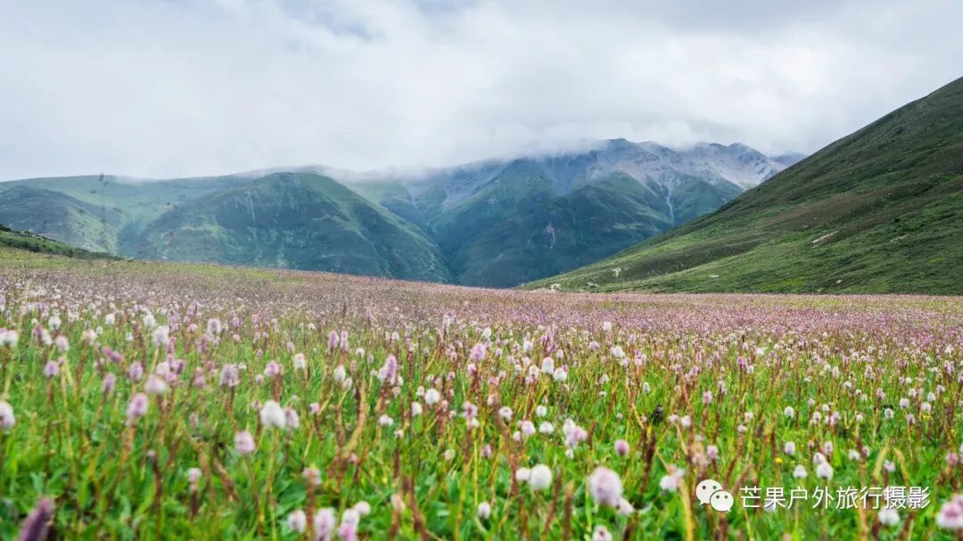 昨夜下了一夜的雨,早晨的多云天气晴朗,然而这一切都是幻觉!我们从营地开始第一个小幅度爬升,然后就开始草原花海漫步之旅。这里草原辽阔,花海盛开,只需要低角度便可拍摄绝美的花海大片。一路在花海中徜徉,走到经幡处,这里花海开得极其旺盛。阴雨绵绵的天气,丝毫不影响我们对风景的执着,同样可以拍出美美的照片。斜切草地,上行至山脊,再下行上山脊,便可看到整个岛岛河谷的全貌,碧绿的河水犹如一条巨龙匍匐在青翠的大地之上,远处雪山一直藏于云雾之中。继续穿越原始森林,下行至河谷,雨季水很大,需要脱鞋过河,最深处触及大腿。过河需要一定的经验,小心被水冲倒,最好去下游找到一个特别安全的过河点,我第一次过河的点我觉得队友可能过不去,于是到下游去寻找了一处水流未超过膝盖的位置,队友都安全过河,我们在河边草地休息片刻,顺便补给午餐。穿越岛岛河谷到达陡坡下,此处陡坡是今日爬升最难的点,比较费力。上到坡顶,就开始沿着路迹一路下行至热梯河谷,需要过一处大河,河流深至大腿根部,但是水流较缓,安全度过。一路沿着湿地路迹走到热梯河谷草地,草地开满了小花,这里绝对是五星级营地的享受。